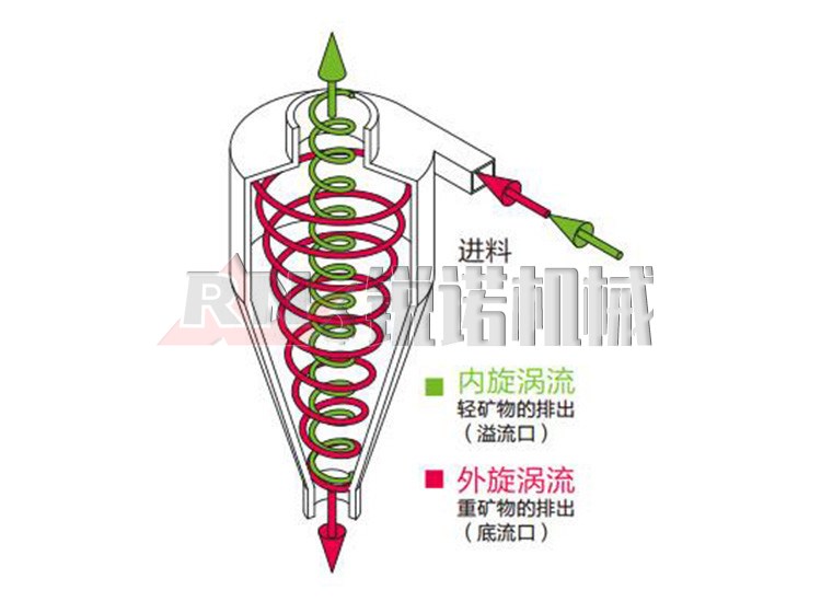 水力旋流器由上部一個中空的圓柱體,下部一個與圓柱體相通的倒椎體,二者組成水力旋流器的工作筒體。除此,水力旋流器還有給礦管,溢流管,溢流導(dǎo)管和沉砂口。